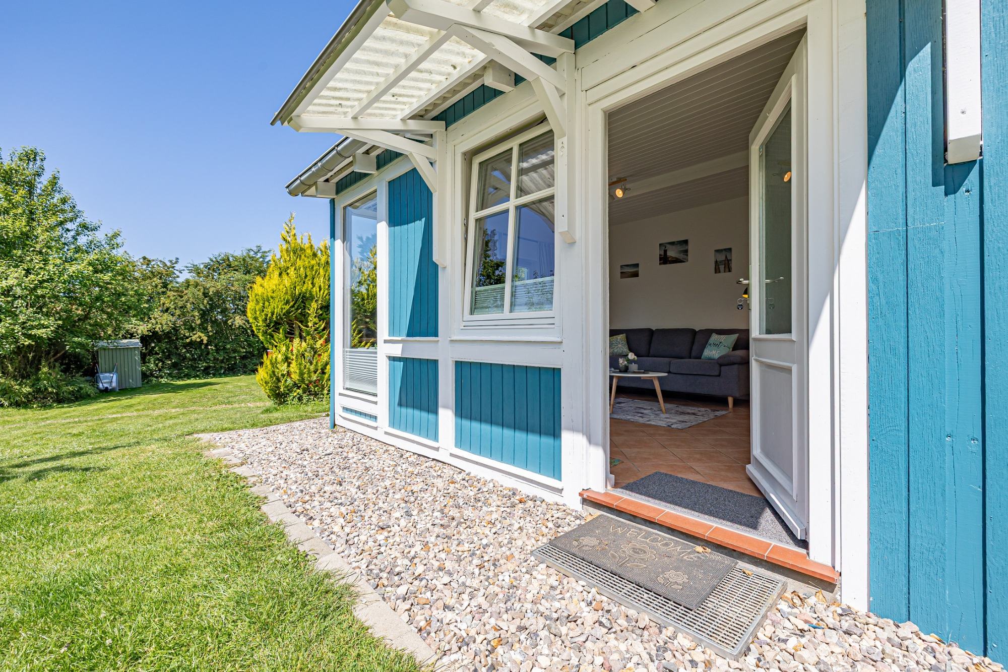- offenes Wohnzimmer/Eingang mit Sofa, Sessel, Schuhregal, TV-Waipu, Radio