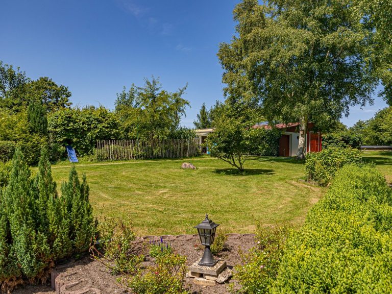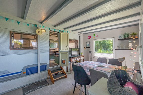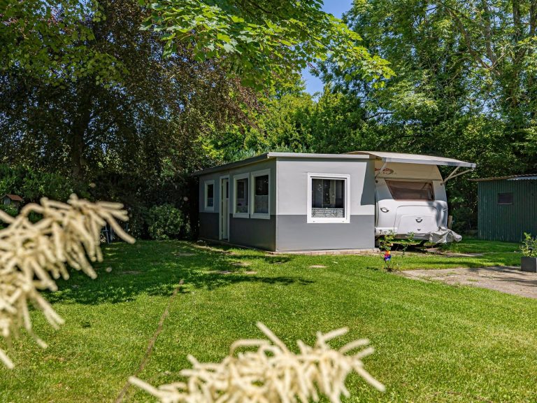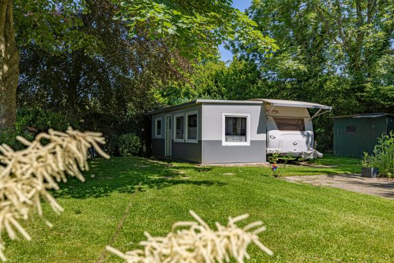 Wohnwagen mit festem Vorzelt, kleinem Garten, kleinem Badehäuschen (Dusche/WC) draußen oder Dusche/WC im Sanitärgebäude