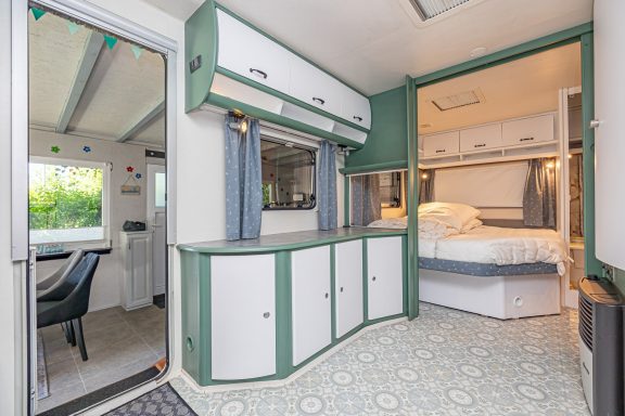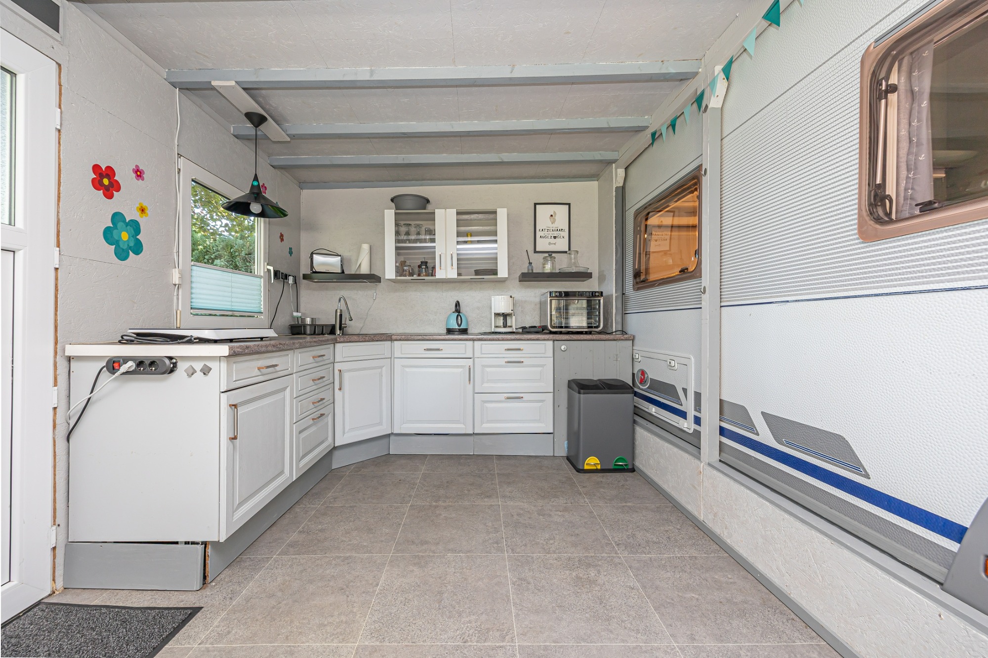 - Vorzelt mit Küche, Essplatz, TV-Satellit, Kaffeemaschine, Toaster, Küchenutensilien